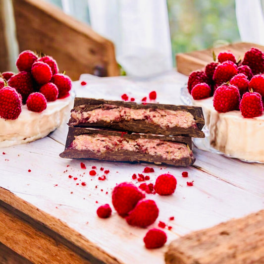 Crispy knafeh, raspberry cheesecake crumble filling, raspberry fruit filling, rich chocolate.