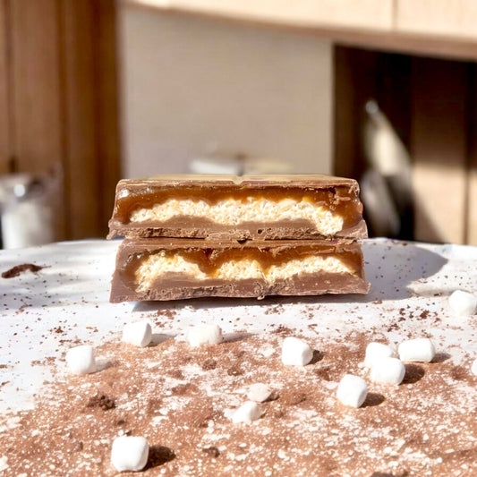 Velvety caramel meets airy marshmallow and crispy golden knafeh, wrapped in silky chocolate.